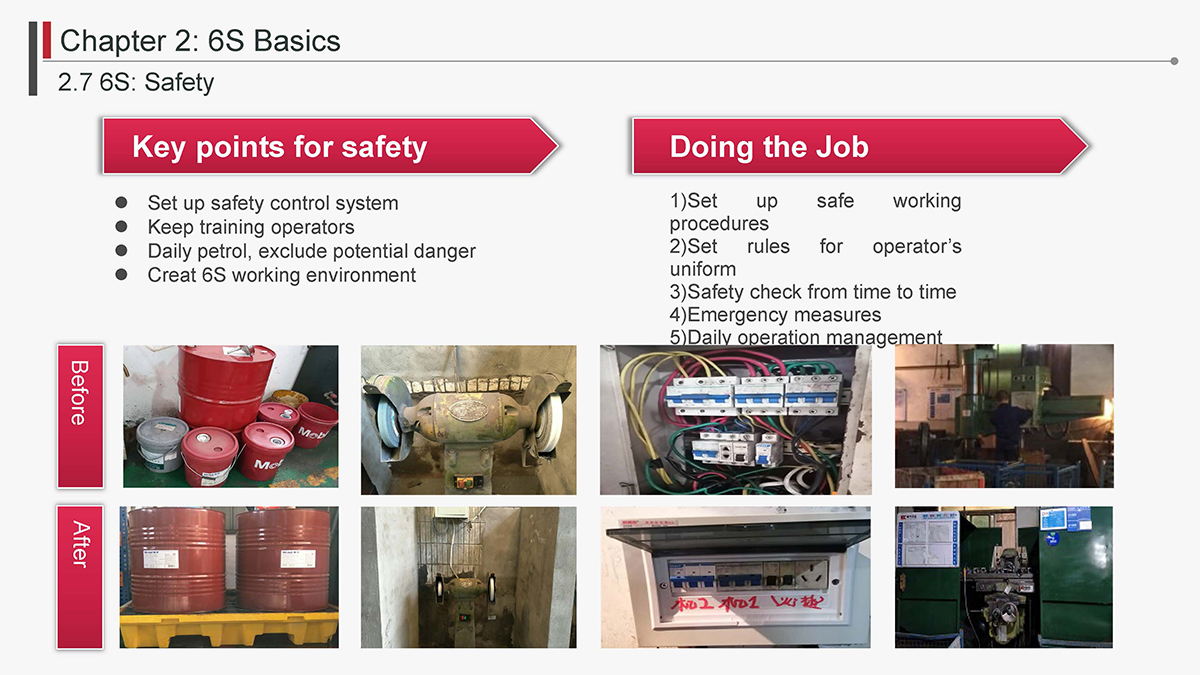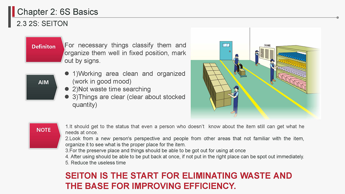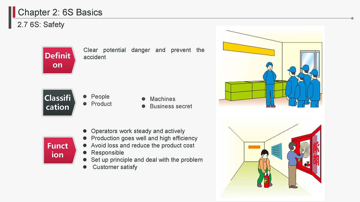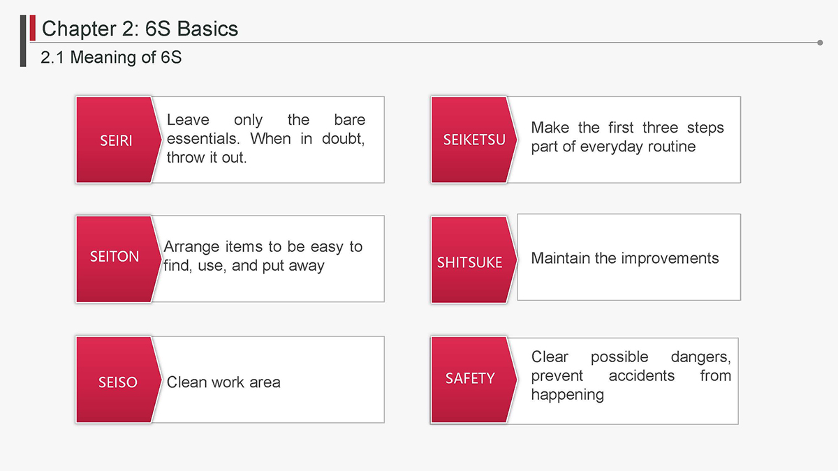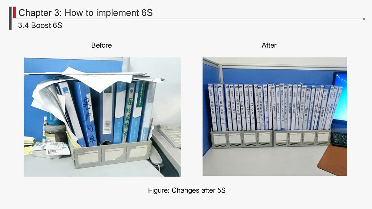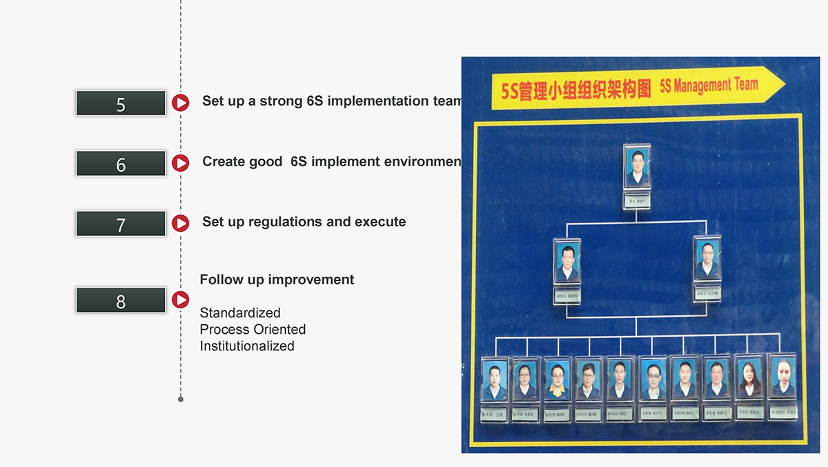 The 5S Principles are recognized in many industries as effective tools for improving workplace organization, reducing waste, increasing efficience and enhancing safety. Visualized management as part of 6S can make any process non-conformance obvious and easily detectable.