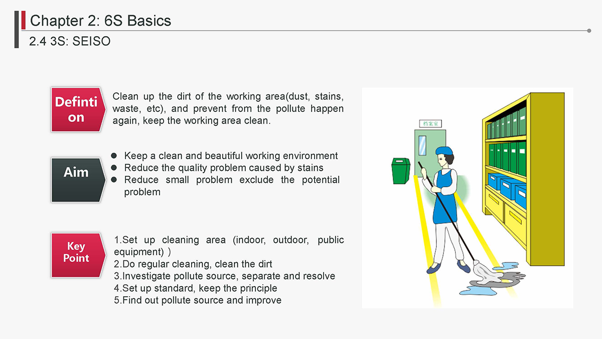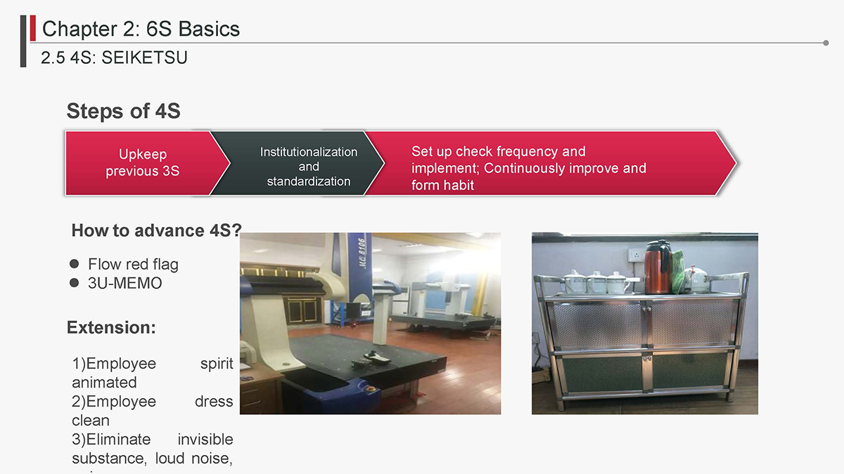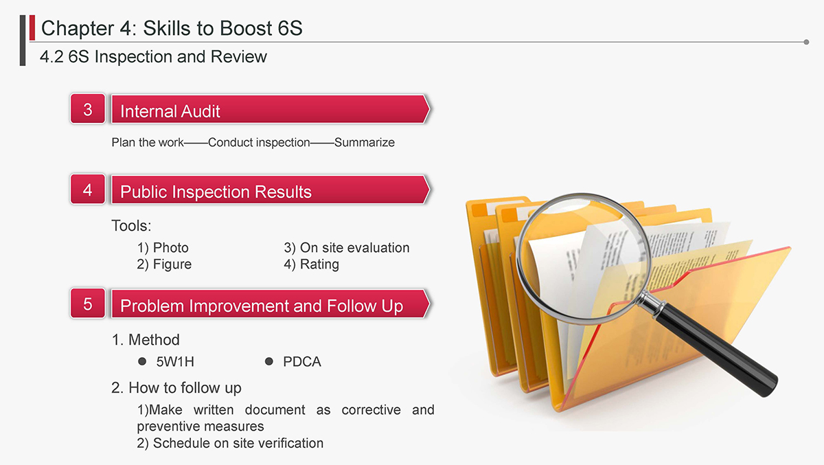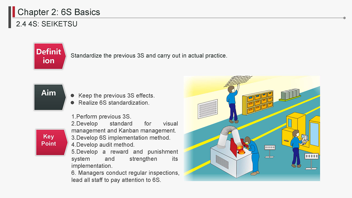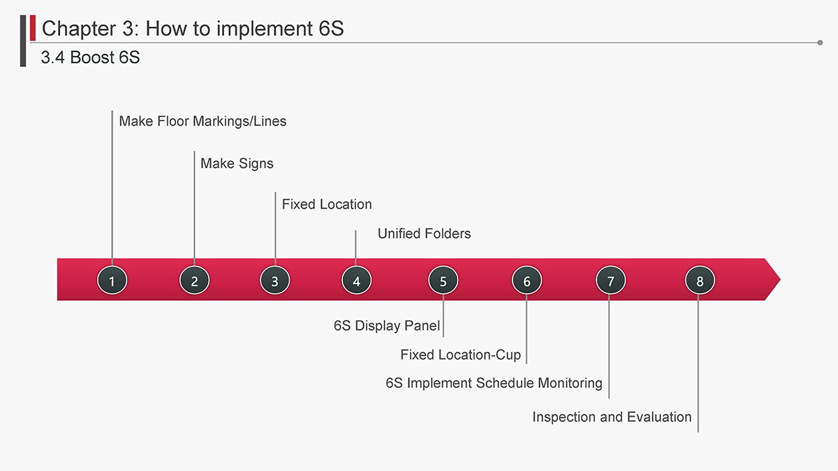 The 5S Principles are recognized in many industries as effective tools for improving workplace organization, reducing waste, increasing efficience and enhancing safety. Visualized management as part of 6S can make any process non-conformance obvious and easily detectable.