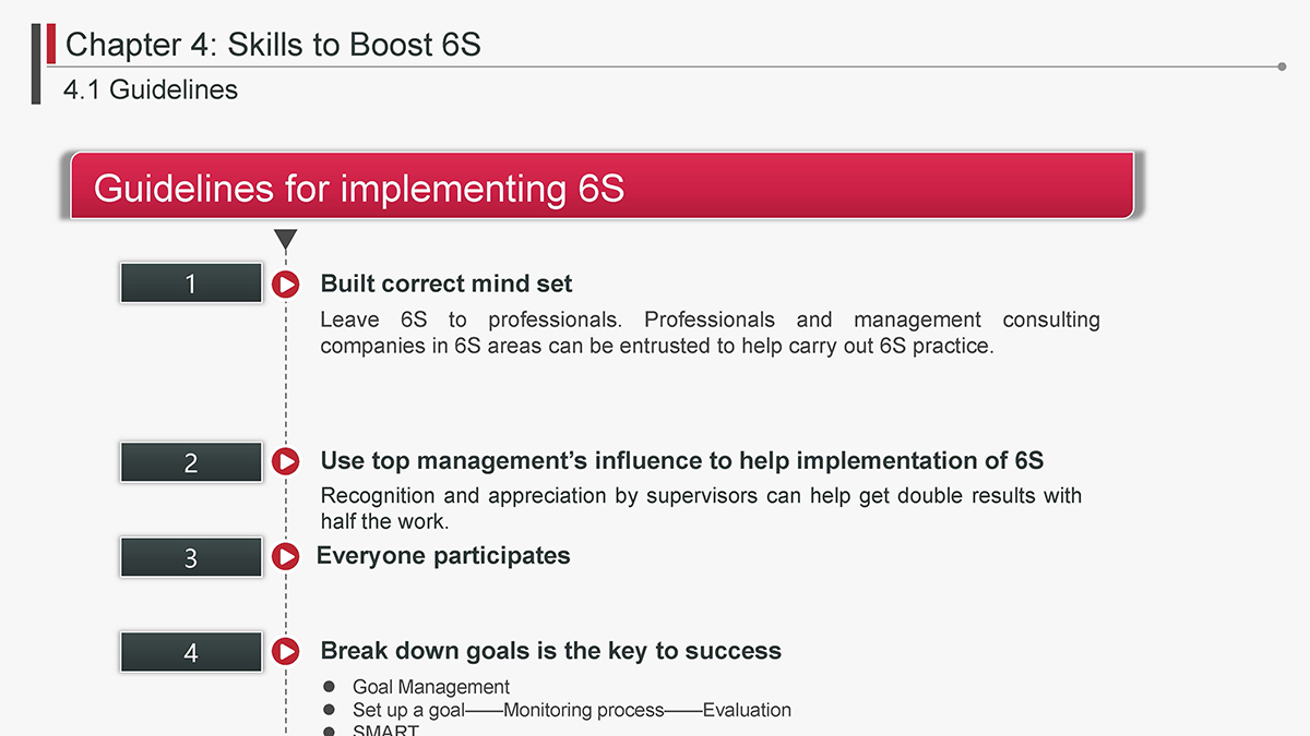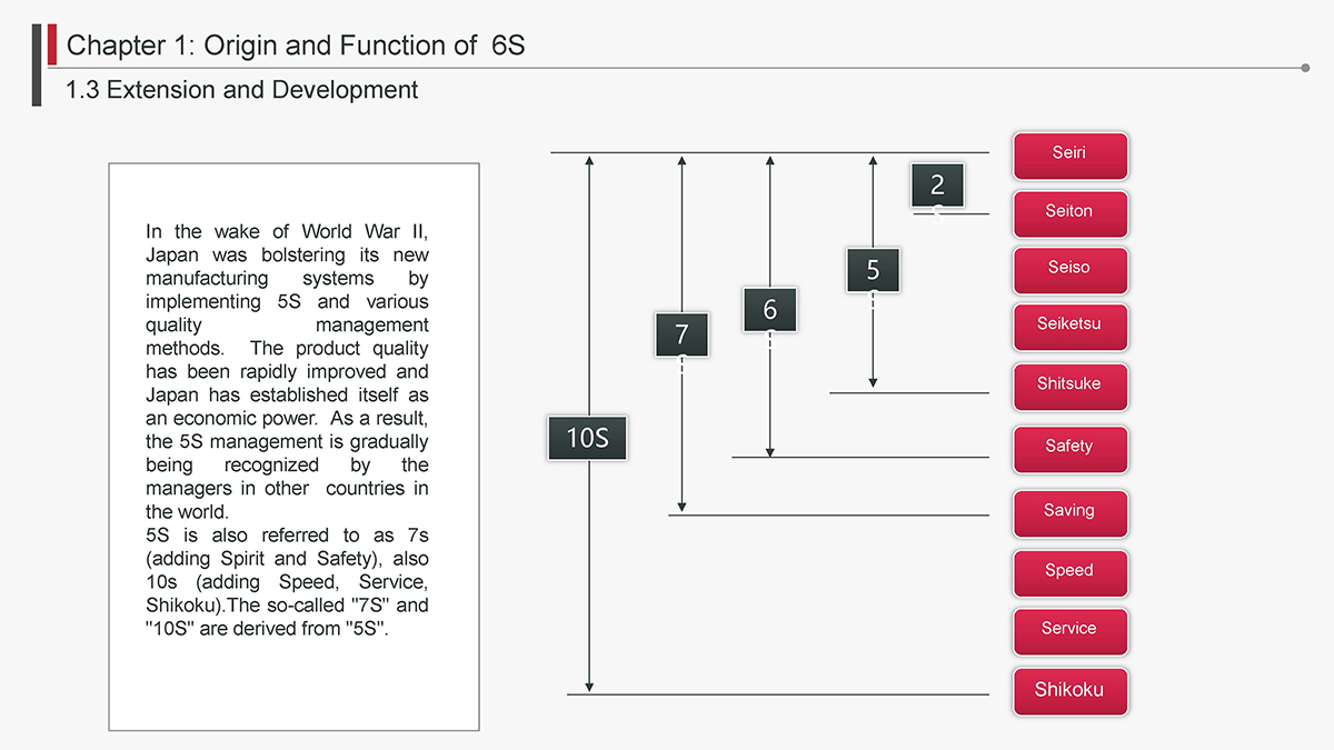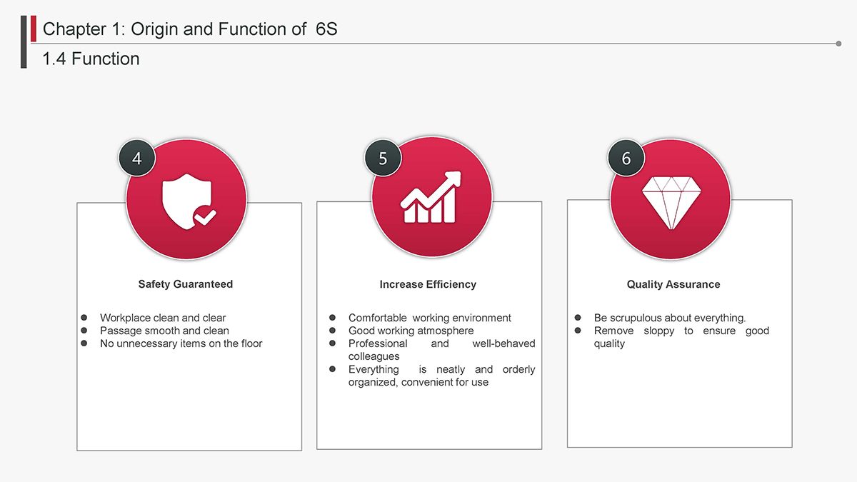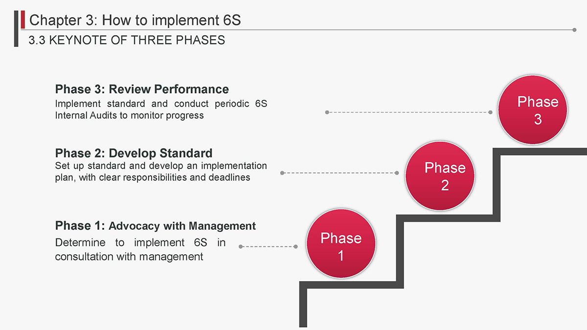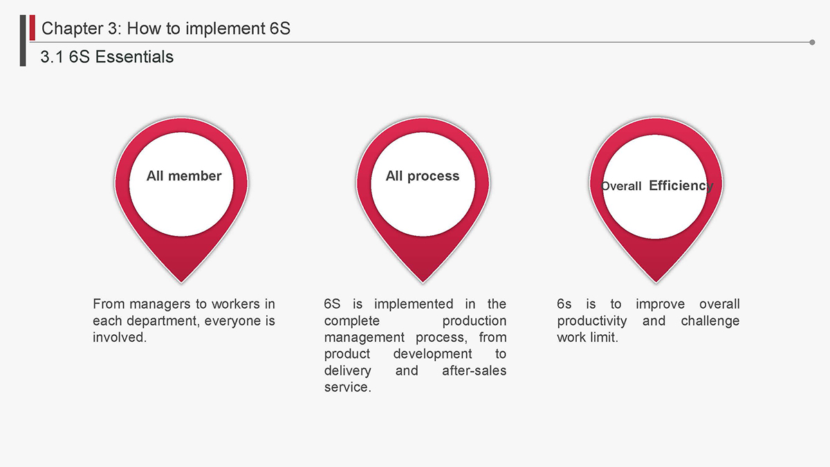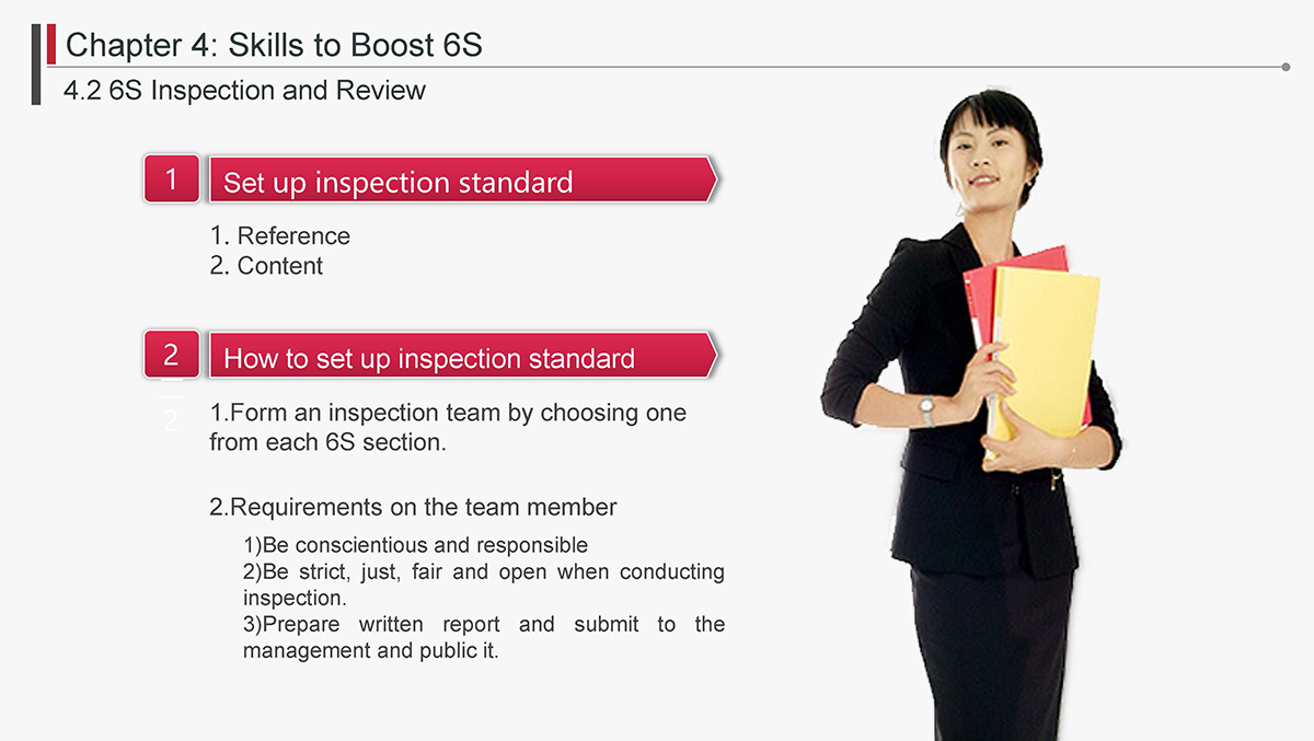 The 5S Principles are recognized in many industries as effective tools for improving workplace organization, reducing waste, increasing efficience and enhancing safety. Visualized management as part of 6S can make any process non-conformance obvious and easily detectable.