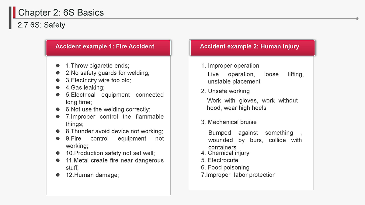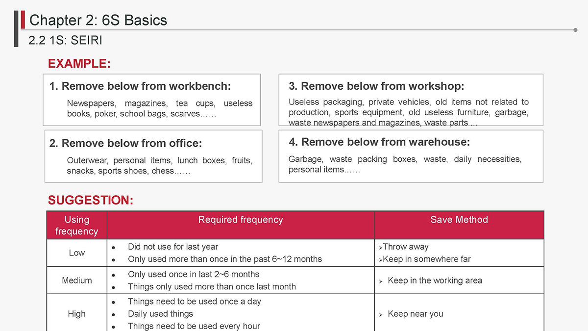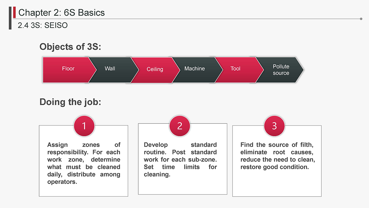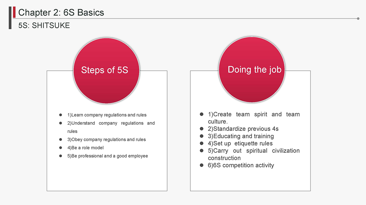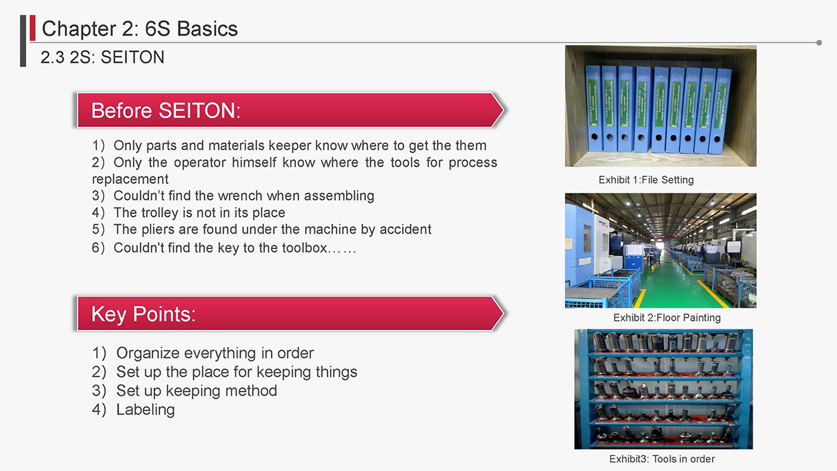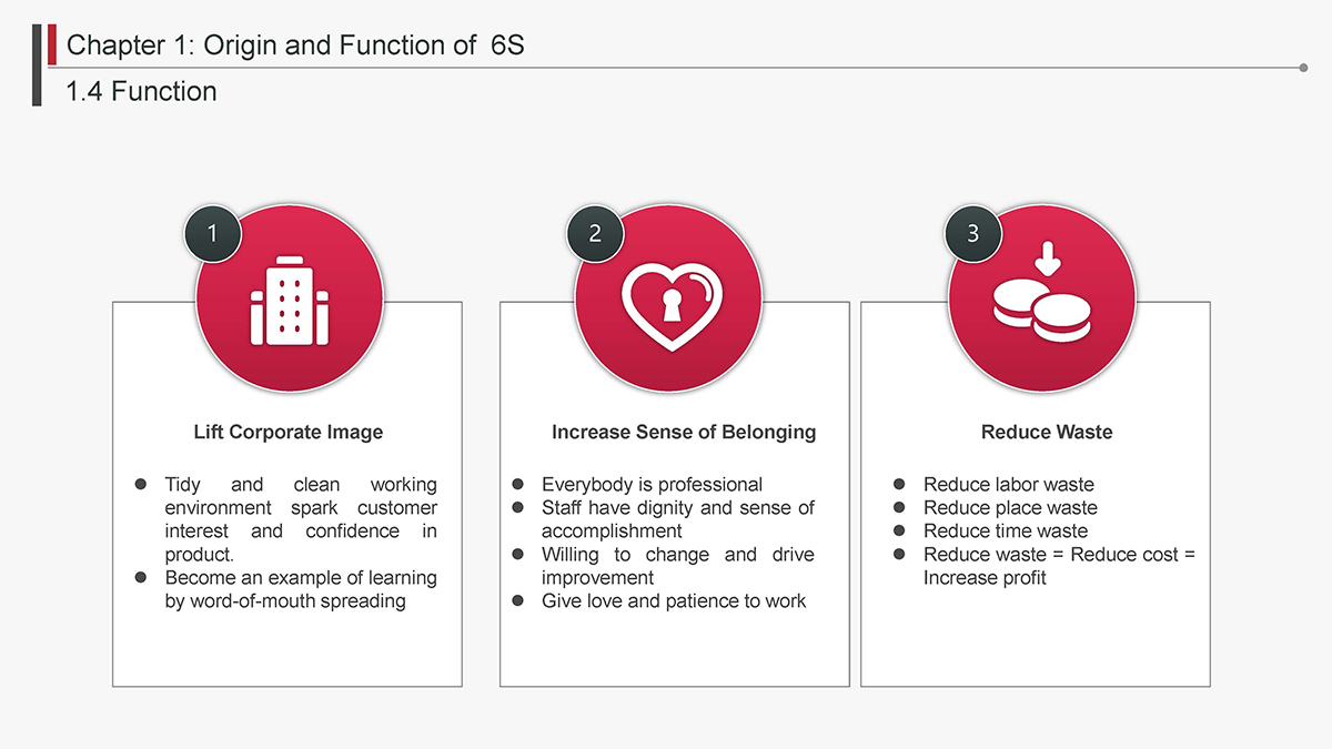 The 5S Principles are recognized in many industries as effective tools for improving workplace organization, reducing waste, increasing efficience and enhancing safety. Visualized management as part of 6S can make any process non-conformance obvious and easily detectable.