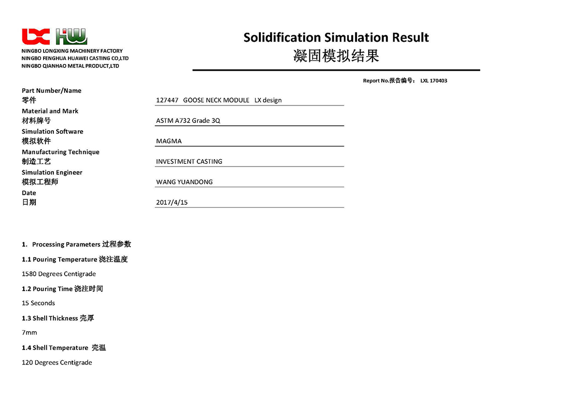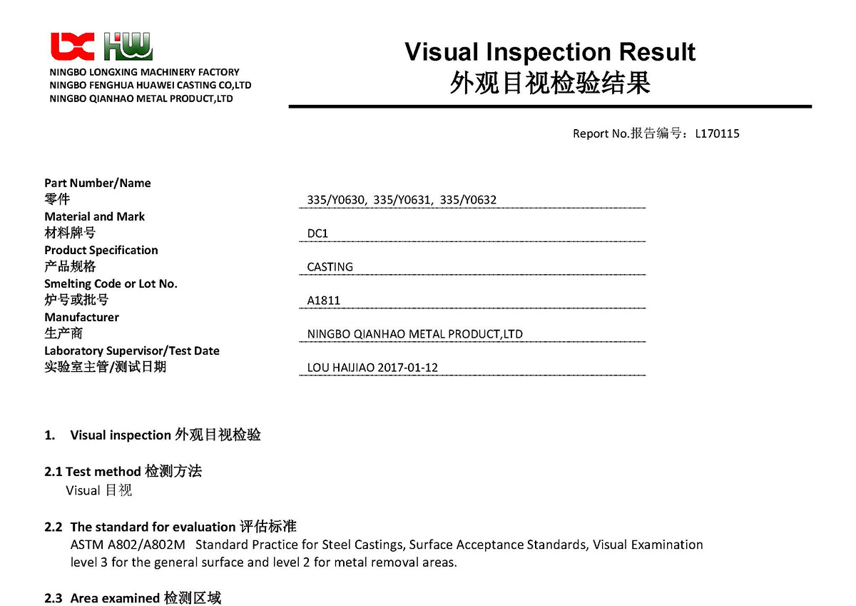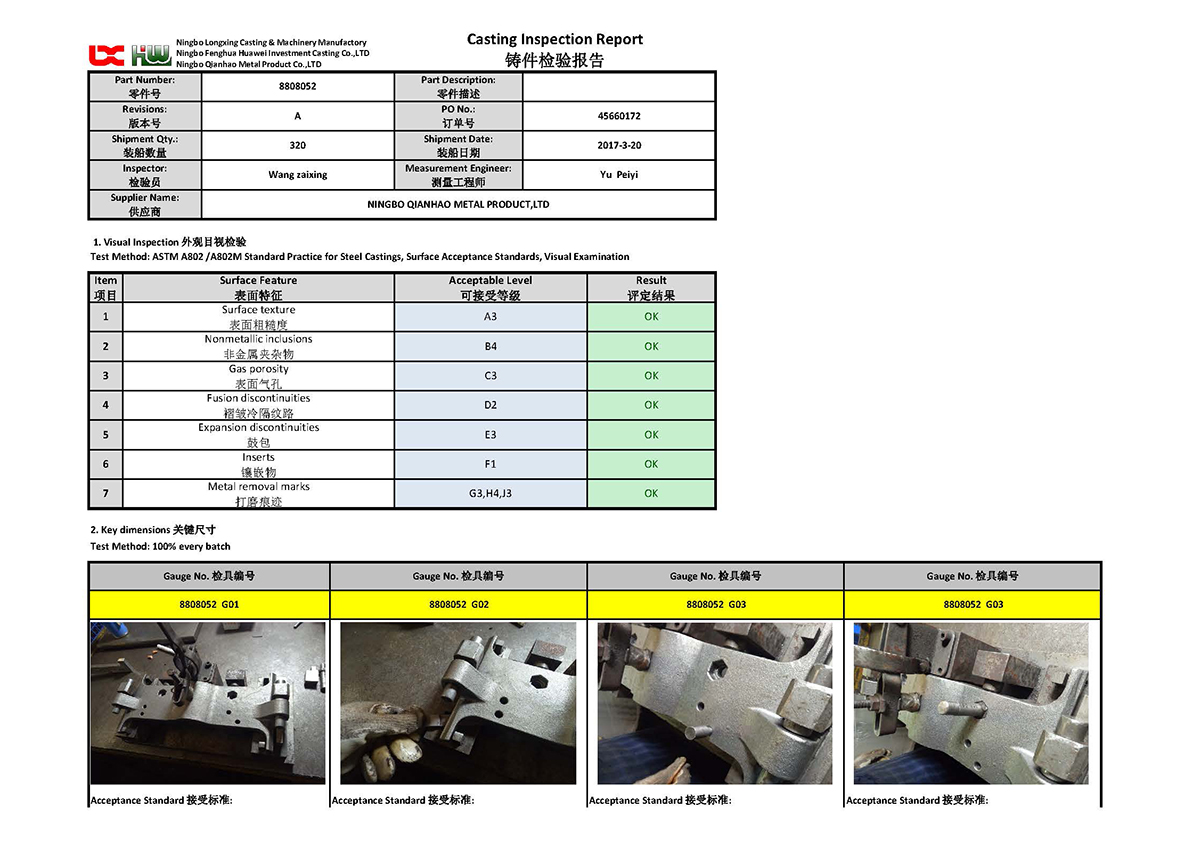 Qianhao quality engineers are involved in every stage of a project. Reports are submitted at each stage. At prototyping, we submit Advanced Product Quality Planning(APQP), like PPAP, Solidification Simulation; At batch production, physical and chemical analysis reports, non-destructive testing reports, dimensional reports etc. At aftersales stage, Corrective Action Report (8D). These reports are passed to customers in paper or electronically. We also make customized documents to fit customer's requirements. Qianhao quality team is looking forward to serve you.